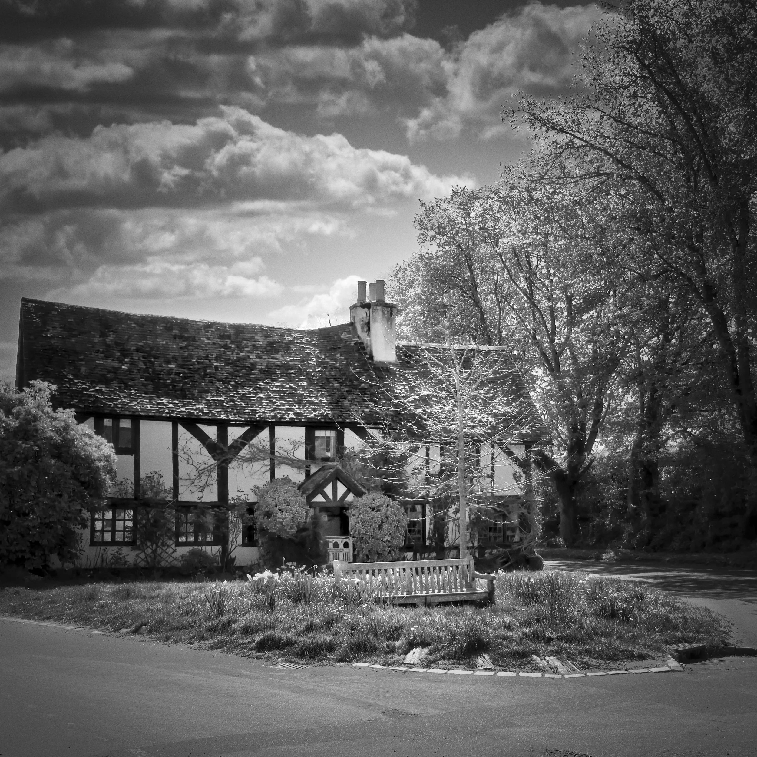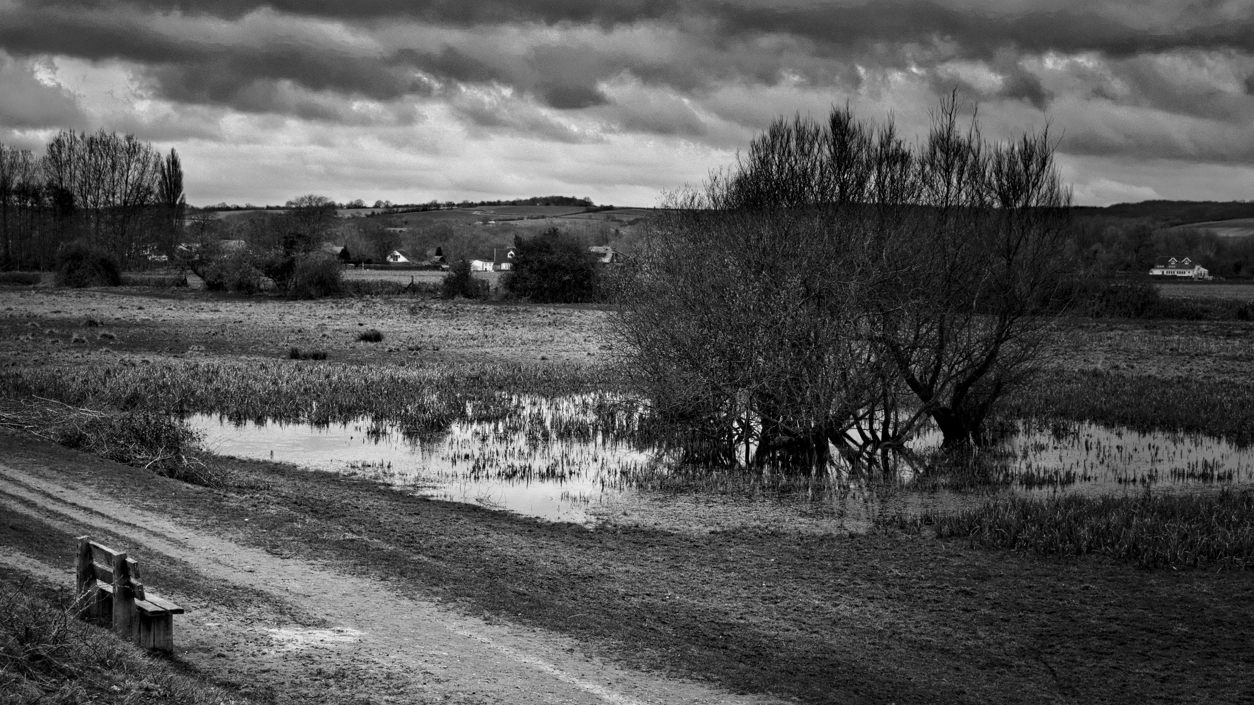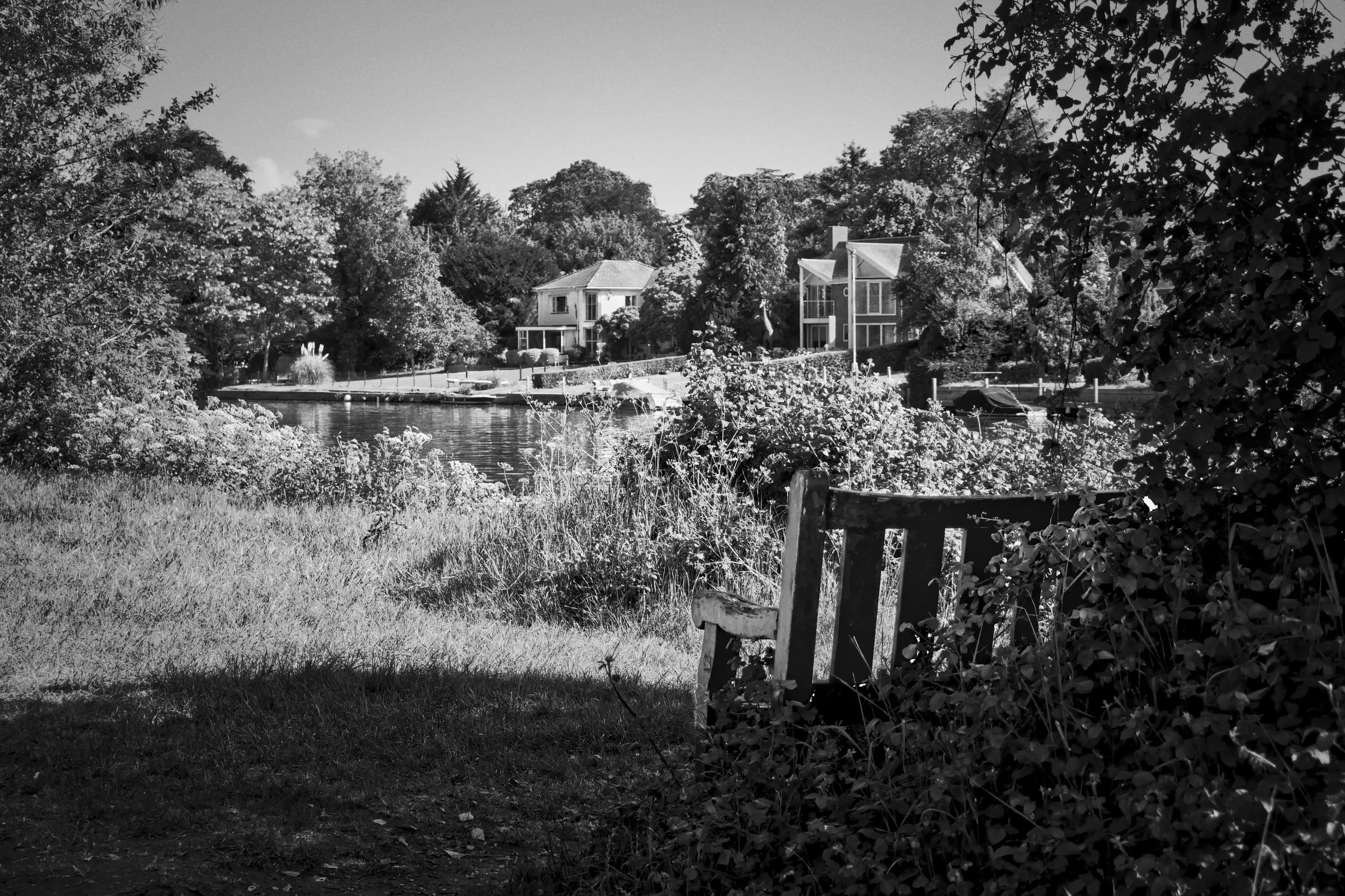 Wooden bench overlooking the River Thames between Bourne End and Cookham — black and white photograph capturing quiet reflection and rural landscape by Walking with Pics